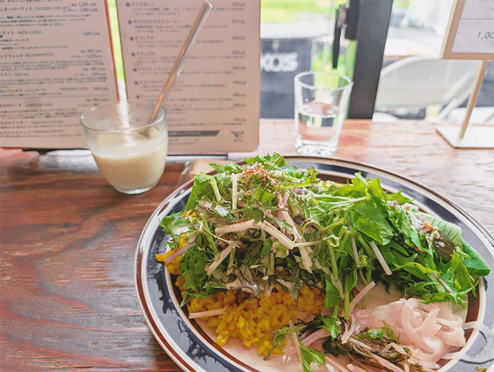 チキンが見えない量のとれたて野菜がもりもり乗っていて、お店オリジナルのココナッツオイルベースのドレッシングがとってもよく合います。