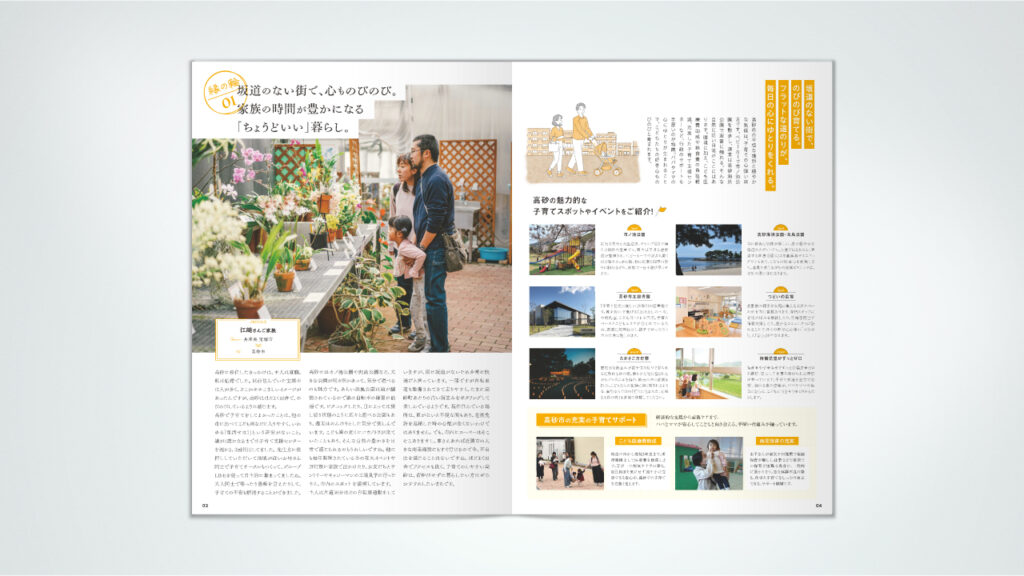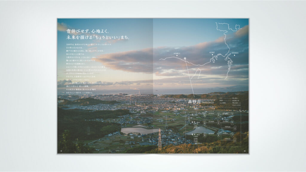 移住者インタビューと自然・利便性・施策といった要素を交差させる構成により、高砂での生活がどのように成り立ち、満たされていくのかを立体的に表現。写真・コピー・構成すべてにおいて“人と人とのつながり”や”縁”を軸に据え、読むことで具体的な暮らしが想起されるクリエイティブへと昇華しました。移住検討層の共感と行動を促すブランディングツールとして設計しています。